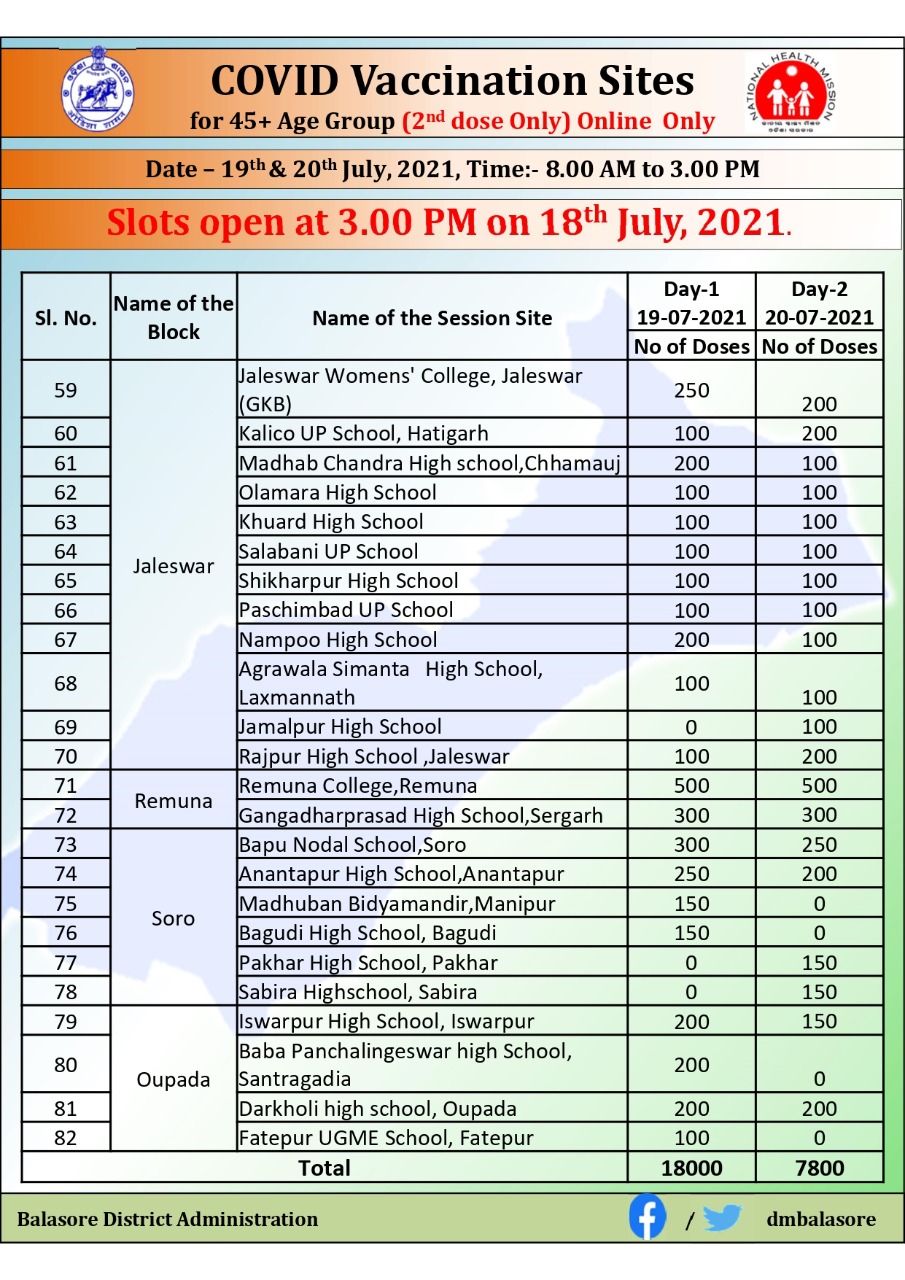 Dm Balasore On Twitter Kindly Find The Vaccination Schedule For The 45 Age Group For 2nd Dose Only For 19th And 20th July Please Book Your Slot Through Cowin Portal 3 00pm